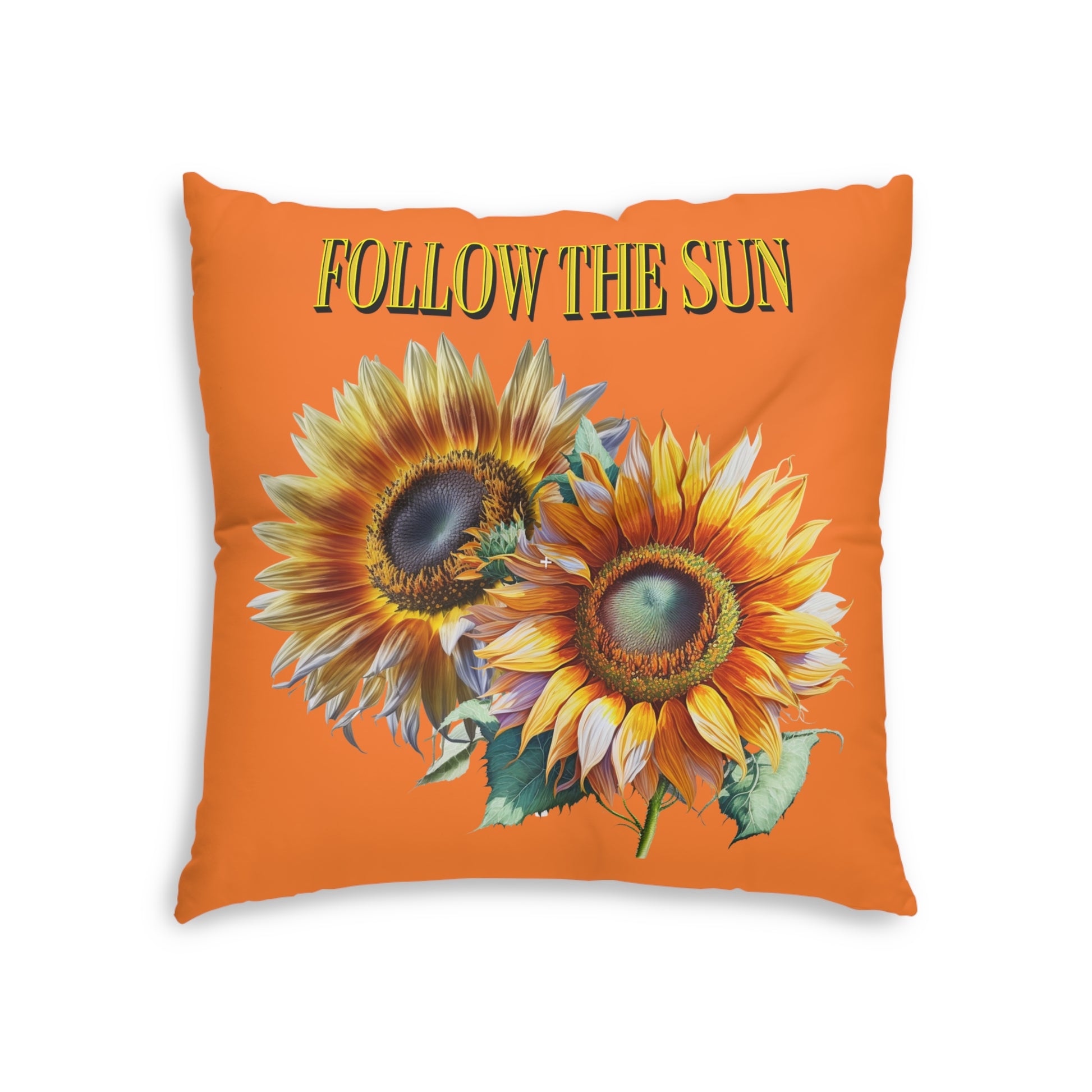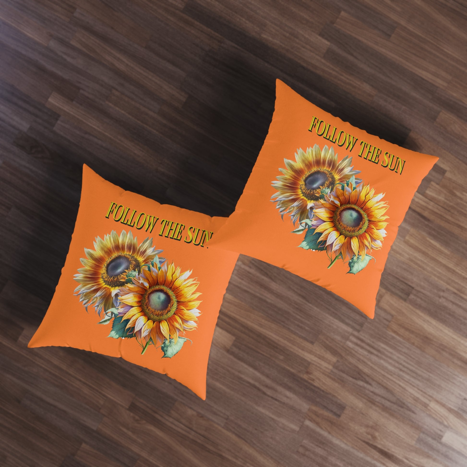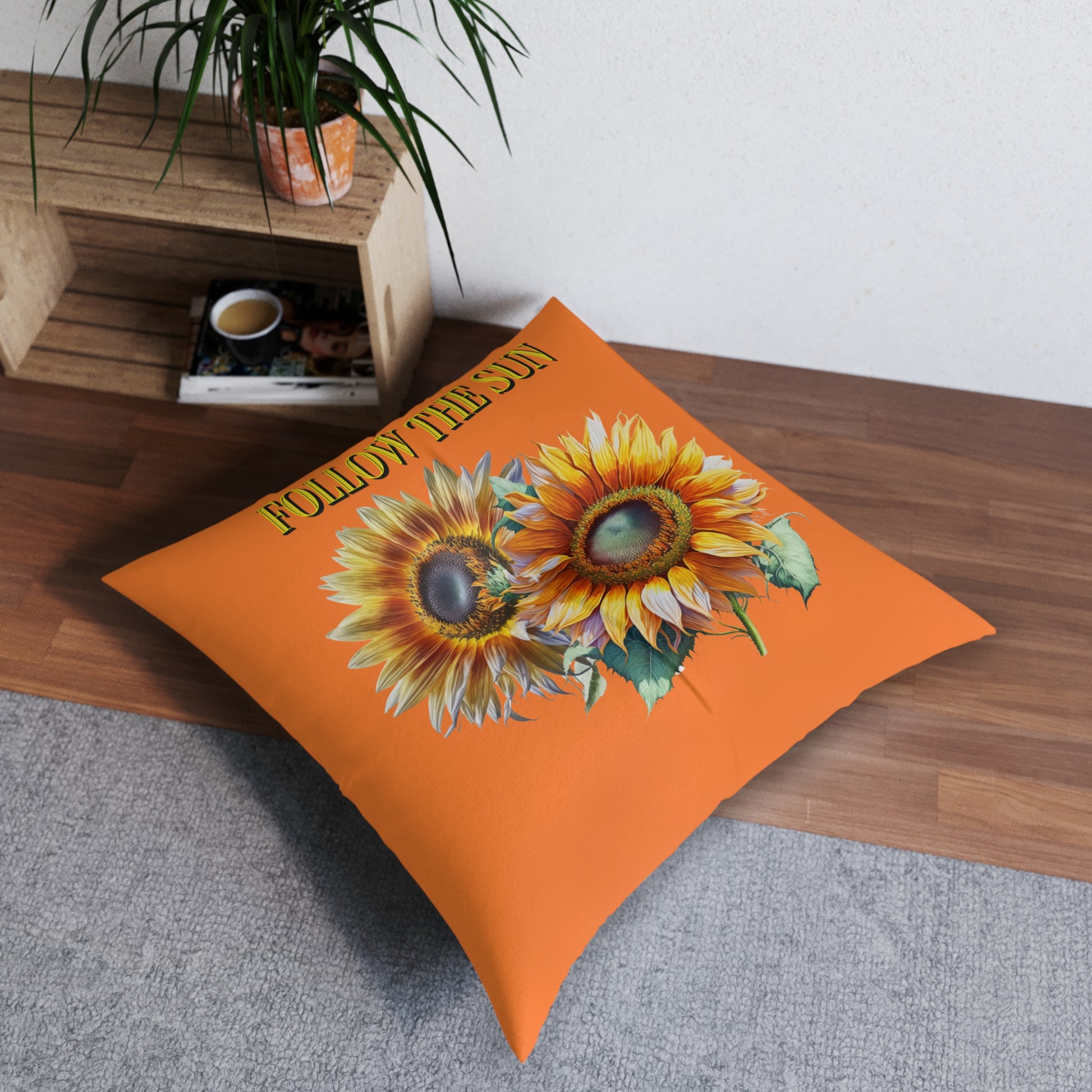 Add a touch of sunshine to your space with our Follow the Sun Orange Tufted Floor Pillow. This playful square pillow features a vibrant sun flower design, bringing the beauty of a garden indoors. Perfect for lounging and adding a pop of color to any room. (Warning: may cause an increase in naps and relaxation!)